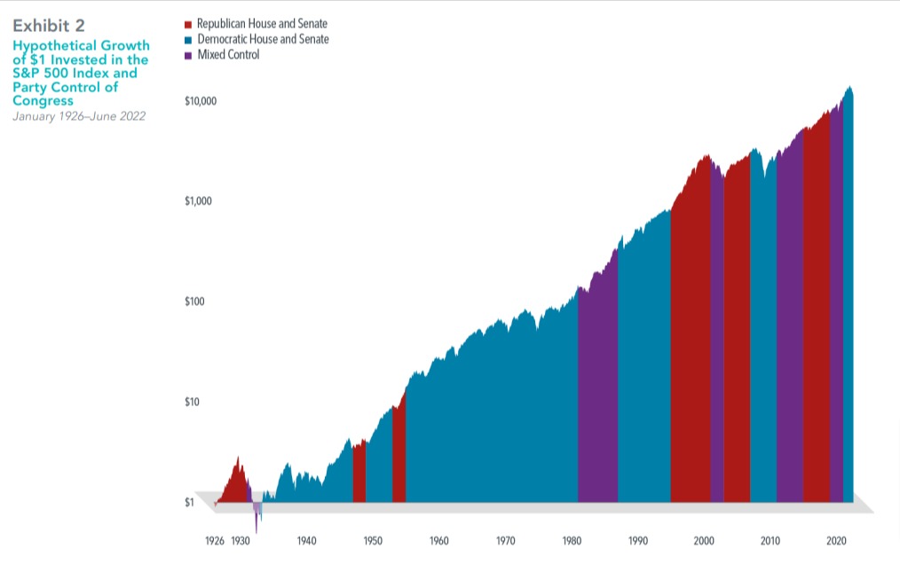 While it can be easy to get distracted by month-to-month or even one-year returns, what really matters for long-term investors is how their wealth grows over longer periods of time. Exhibit 2 shows the hypothetical growth of wealth for an investor who put $1 in the S&P 500 Index in January 1926. Again, the chart lays out party control of Congress over time. And again, both parties have periods of significant growth and significant declines during their time of majority rule. However, there does not appear to be a pattern of stronger returns when any specific party is in control of Congress, or when there is mixed control for that matter. Markets have historically continued to provide returns over the long run irrespective of (and perhaps for those who are tired of hearing political ads, even in spite of) which party is in power at any given time.