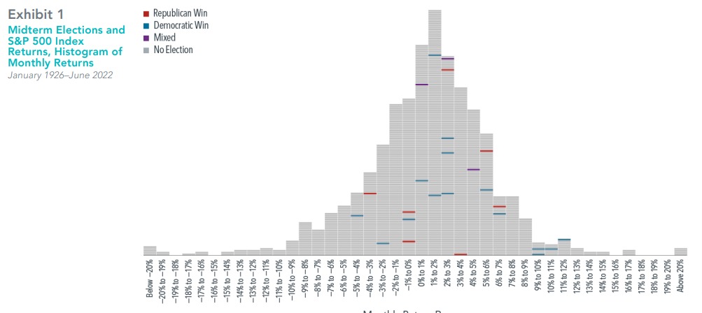 But what about congressional elections? For the upcoming midterms, market strategists and news outlets are still likely to offer opinions on who will win and what impact it will have on markets. However, data for the stock market going back to 1926 shows that returns in months when midterm elections took place did not tend to be that different from returns in any other month.