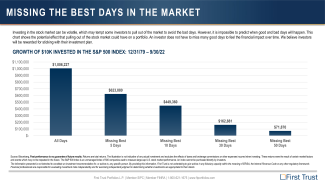 Still, as a rather snarky saying in the investment industry goes: “The Market Timing Hall of Fame is empty.” The main reason is that you need to make two correct decisions. The first is the easy one – when to get out. It takes zero discipline and actually feels good at first. The second is WAY harder – when to get back in. That takes enormous discipline and fortitude. Even though there is no real Market Timing Hall of Fame, it would be empty if there was. The chart (courtesy of First Trust) below is the difference in performance by just missing the best 5, 10, 30, and 50 days of the S&P500 since 1979. It’s big.