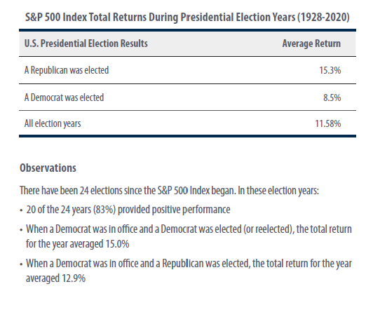 Here’s the takeaway: Despite many investors citing “election concerns” as reasons to avoid/delay buying stocks, the data shows that the market averages 11.58% return during election years and have been positive 83% of the time. Those figures are both ABOVE the historical averages and hardly anything to be overly concerned about. We’ve included the entire piece from First Trust if you’d like some additional stats/perspective surrounding elections and their historical impact.