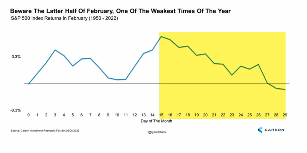 3: Yes – the market was fairly weak in February of this year, with the S&P 500 losing 2.61%. Overall, this shouldn’t be too surprising coming off such a strong January, but if we look closer, we’ll see that historically, February is a weak month. In fact, the 2nd half of February is historically one of the weakest periods of the year. See the graph below from Ryan Detrick of Carson Investment Research. So, again, historic trends continue to prove valuable as a road map. That bodes well for March and April, at least.
