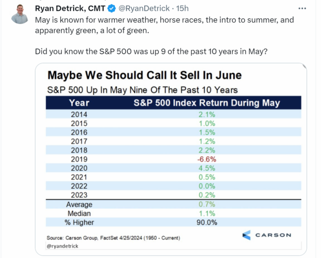 So, as you can see, old adages/rules-of-thumb/wives tales are no way to invest. May could turn out to be a great month (and often is), but I think we’ll continue to churn here for a while below all-time highs as we try to figure out the next direction for interest rates.